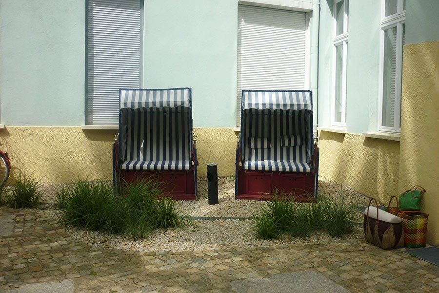 gräser, die an strandhafer erinnern, außerdem strandkörbe und das meer an die wände gemalt.